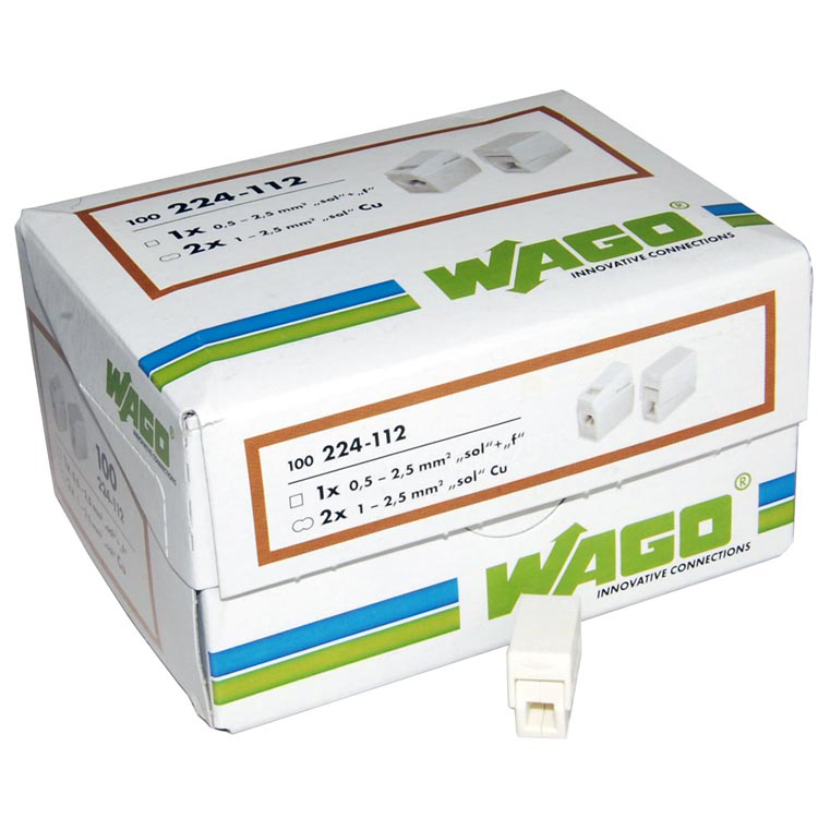 Home > Products > Cable Accessories > Wago Connectors & Junction Boxes > Wago Lighting Connector 2 x Pushwire to Cage Clamp, 224-112Wago Lighting Connector 2 x Pushwire to Cage Clamp, 224-112